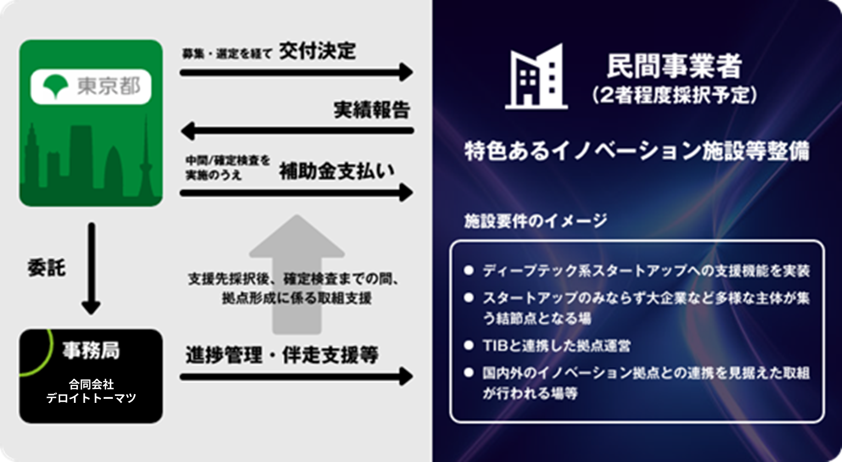 ディープテック・スタートアップのニーズを捉えたラボや実証フィールドなどの研究開発環境の整備に向け、既存の類似施設にはないような強力な支援機能を有するイノベーション拠点の形成に取り組む民間事業者を支援します。事業スキーム